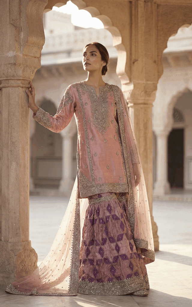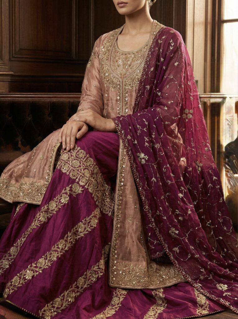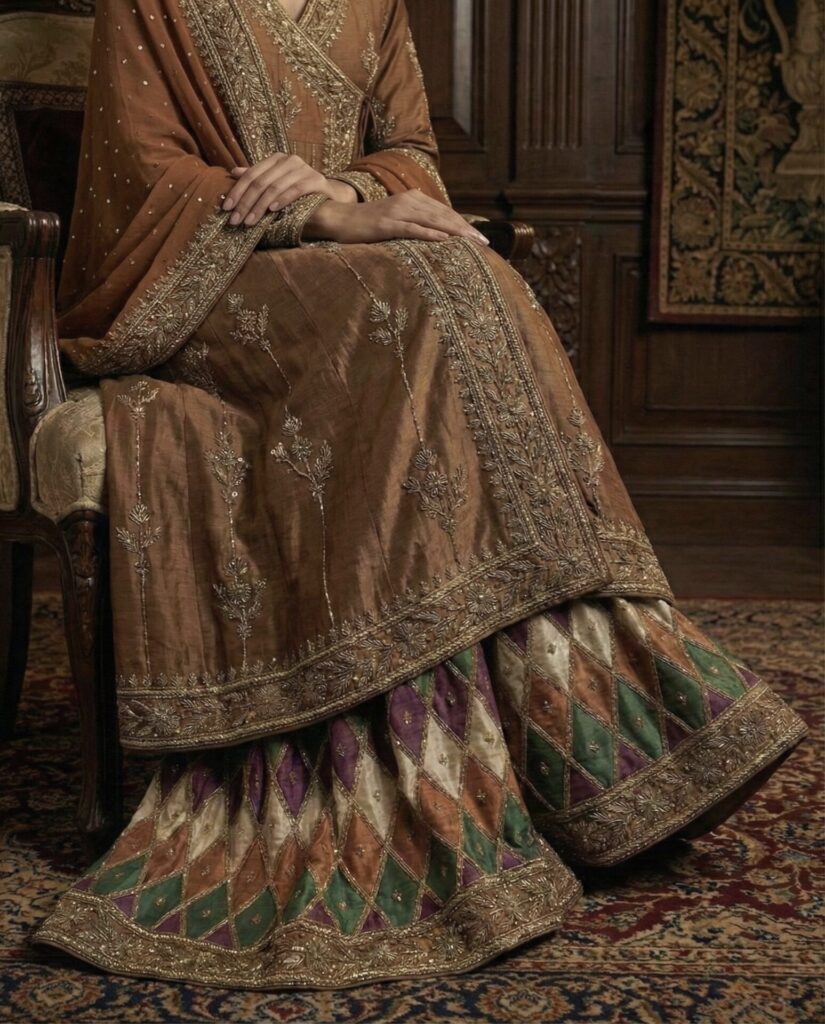 Floral inspirations, chatapati ghararas, and jewel-toned palettes define Firdaus — allowing each piece to feel festive, feminine, and dignified.