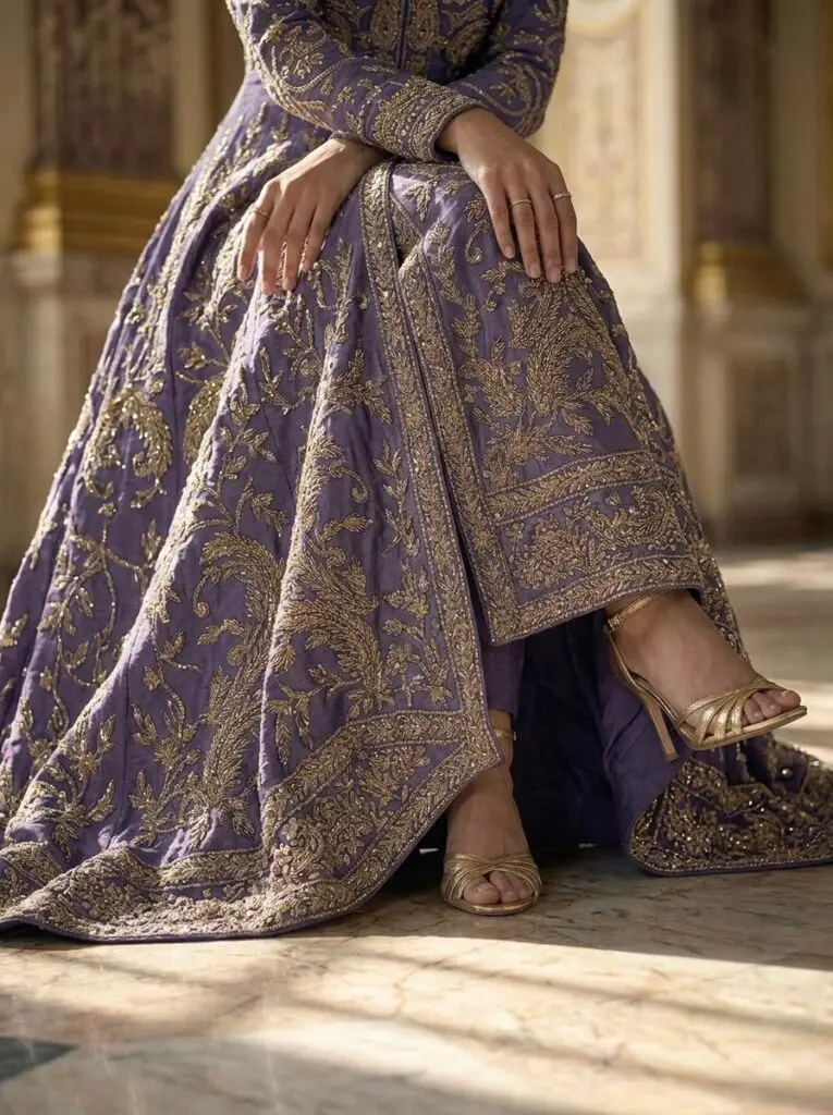 Step into a world of regal splendor with this exquisite amethyst-hued ensemble, a masterpiece that beautifully marries traditional grandeur with modern sophistication.