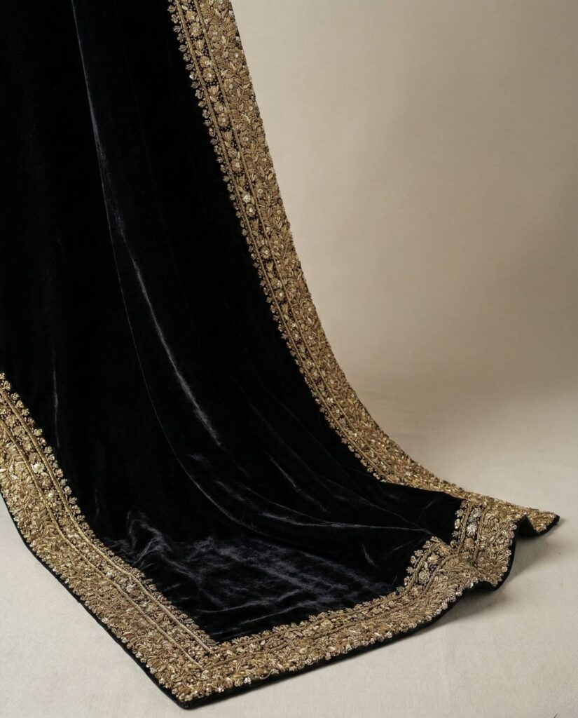 Encircling this darkness is a meticulously hand-embroidered zardozi border, worked in antique gold with fine naqshi, dabka, and subtle metallic accents. The richness of the embroidery emerges like constellations against the night—intricate, radiant, and deeply captivating.